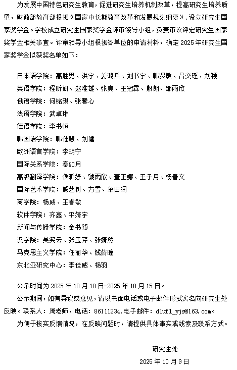 大连外国语大学2025年研究生国家奖学金拟获奖名单公示